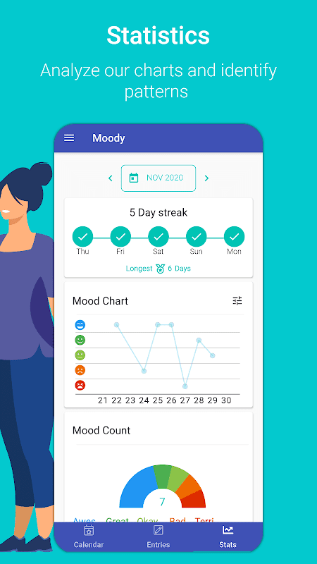 व्यावहारिक आँकड़े आपको अपने बारे में अधिक जानने में मदद करेंगे, अपने मूड-ट्रैकर जर्नलिंग स्ट्रीक को बनाए रखेंगे, सामान्य मूड और गतिविधि संयोजनों की पहचान करेंगे, और बहुत कुछ।