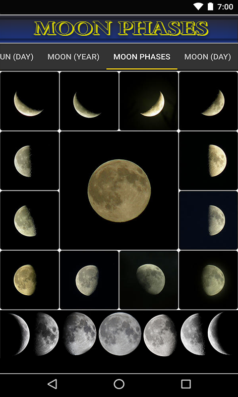 यह एप्लिकेशन चंद्रमा, सूर्य और अन्य सभी प्रमुख ग्रहों के बारे में वर्तमान चंद्र चरण, किसी भी महीने के लिए चंद्र चरण और अन्य वास्तविक समय की जानकारी प्रदर्शित करता है।