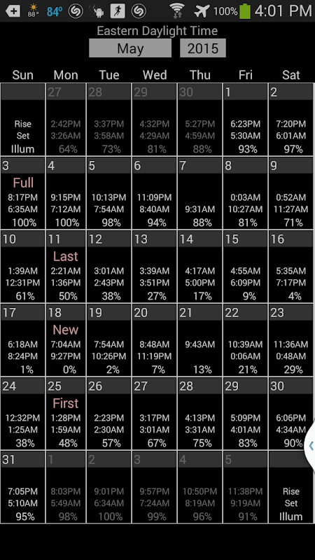 यह एप्लिकेशन आपके वर्तमान स्थानीय समय के लिए समायोजित चाँद चरणों को प्रदर्शित करता है (और यह जरूरत है कि तारीखों के लिए दिन के उजाले बचत समय के लिए समायोजित कर देता है)। तो तुम चरणों सबसे कैलेंडर केवल जीएमटी समय के लिए चरण दिखाने के रूप में, अपने स्थानीय समय के लिए समायोजित नहीं है कि मुद्रित कैलेंडर, या अन्य कैलेंडरों से उन लोगों के रूप में ही नहीं हैं देख सकते हैं।