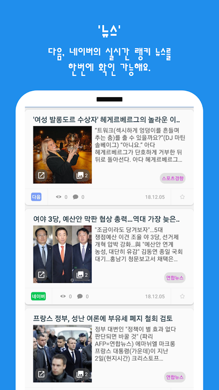 - 다음과 네이버의 랭킹뉴스 및 사회, 스포츠, 정치, IT등 주요 뉴스를 모두 모아볼 수 있습니다.