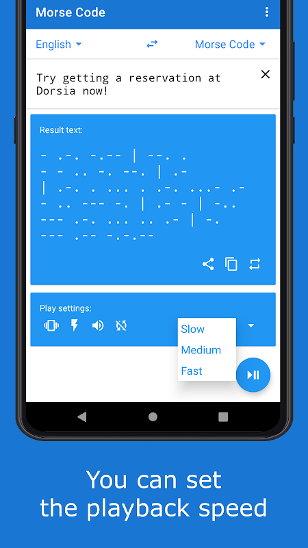 अपने पाठ को मैसेंजर और सोशल नेटवर्क्स के माध्यम से दोस्तों के साथ मोर्स में साझा करें। ऐप अन्य ऐप्स से ग्रंथों को भी स्वीकार कर सकता है।