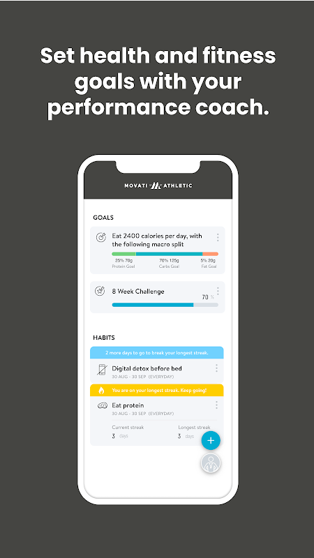 MOVATI प्रदर्शन कोचिंग ऐप के साथ, आप अपने व्यक्तिगत प्रशिक्षक की मदद से अपने वर्कआउट और भोजन पर नज़र रखना, परिणामों को मापना और अपने फिटनेस लक्ष्यों को प्राप्त करना शुरू कर सकते हैं।