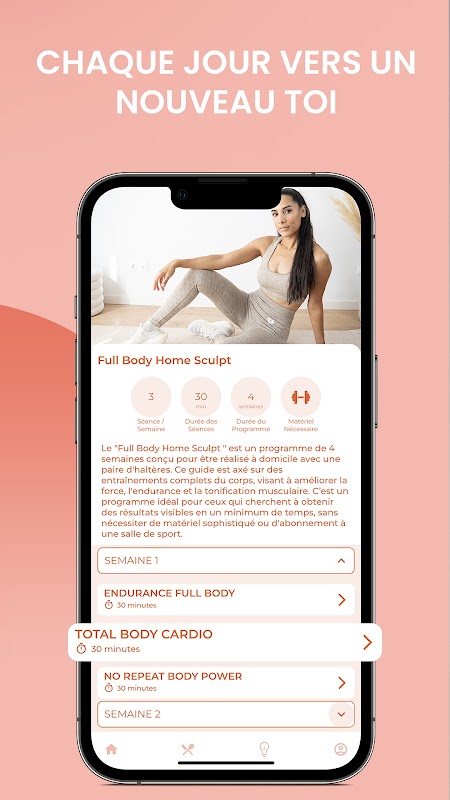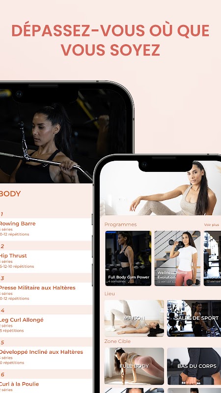 - विविध प्रशिक्षण कार्यक्रम: 100 से अधिक सत्रों में से चुनें जो आपके वातावरण (घर पर या जिम में) के अनुकूल हों और विशिष्ट मांसपेशी समूहों (पूरे शरीर, निचले शरीर, पेट और अधिक) को लक्षित करें।