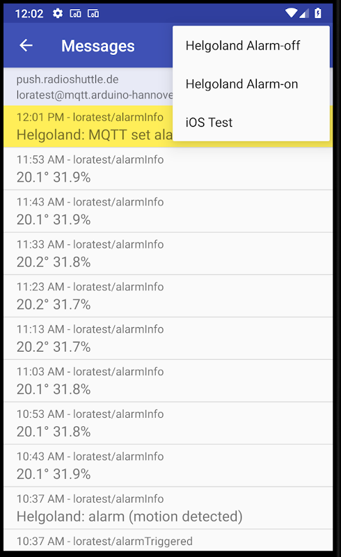RadioShuttle LoRa पीयर-टू-पीयर सॉल्यूशंस के डेवलपर्स ने MQTT वातावरण, "MQTT पुश क्लाइंट" ऐप के लिए एक सार्वभौमिक ऐप डिज़ाइन किया है। यह एमक्यूटीटी संदेश प्राप्त करता है, सेकंड के भीतर पंजीकृत विषयों के लिए पुश नोटिफिकेशन (वैकल्पिक रूप से ध्वनि के साथ) जारी करता है, और उन्हें एक सूची या जीयूआई ("डैशबोर्ड") में प्रदर्शित करता है। उपयोगकर्ताओं को महत्वपूर्ण घटनाओं जैसे सेंधमारी, पानी की समस्या, खराब शीतलन, तापमान के आंकड़े आदि के बारे में सीधे मोबाइल फोन या समूह के सभी मोबाइल फोन पर सूचित किया जाएगा, उदा। परिवार के सदस्य।