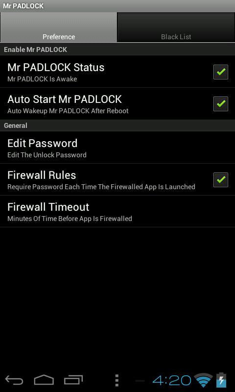 WARNING: Placing a Firewall around 'Settings' App will block all access to this feature on Android. If the Mr PADLOCK numeric password is forgotten the only way to access it will be a complete factory Android OS reinstall. DO NOT LOOSE YOUR PASSWORD! The default password if it has not been changed is 1234. If you forget your password WE CAN NOT unlock it you will need to reset your device to the factory setup loosing any information that is not backed up externally from the Android mobile device. We are not responsible for any loss of data as a result of lost passwords and the use of this App.