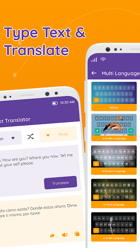 सुंदर थीम के साथ बहु भाषा कीबोर्ड का उपयोग करें और टेक्स्ट ट्रांसलेटर से बात करें