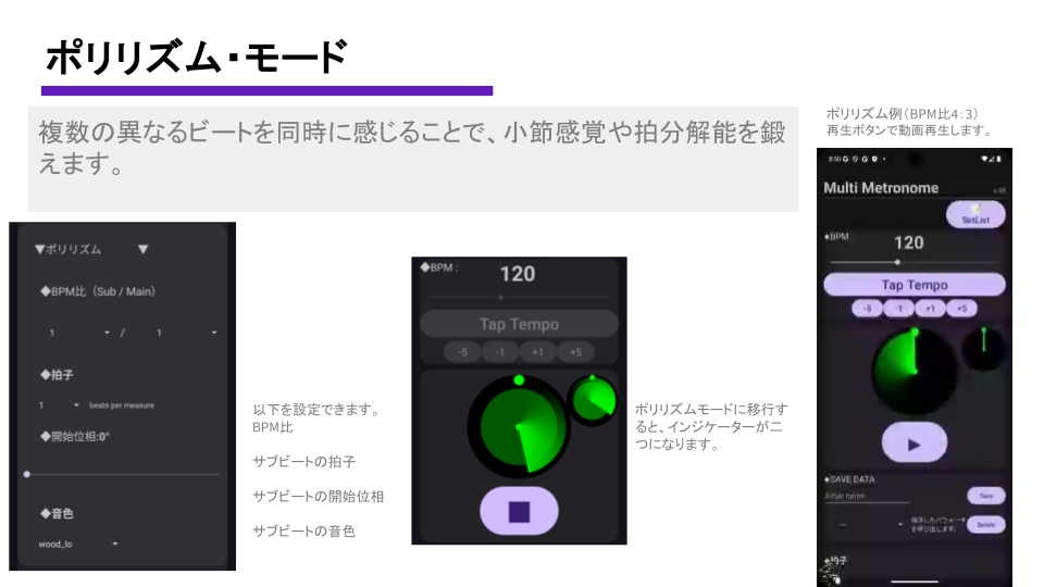 10 सेट सूचियाँ और असीमित संख्या में गाने (BPM प्रीसेट) दैनिक अभ्यास दिनचर्या या लाइव प्रदर्शन के लिए सेट सूचियों के रूप में उपयोग किए जा सकते हैं।