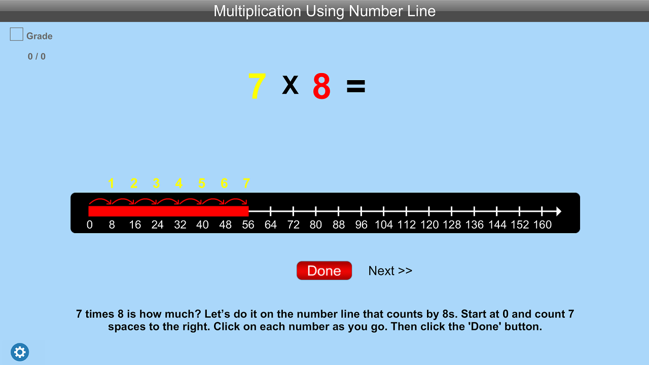 यह कार्यक्रम छात्र को गुणा को समझने में मदद करने के लिए संख्या रेखा का उपयोग करता है
