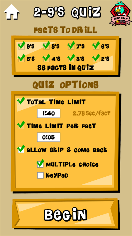 गुणन तथ्यों के समय परीक्षण 2 के माध्यम से 9 है। तेज़ और अधिक सटीक स्कोर उच्च रैंक अर्जित करते हैं। छूटी हुई समस्याओं की समीक्षा करें। अध्ययन के संकेत। शिक्षकों और अभिभावकों को ईमेल परिणाम।