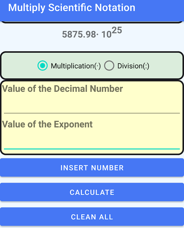 जब उपयोगकर्ता संख्याओं का परिचय देता है तो ऐप संचालन करेगा। गुणा करने के लिए, हम सभी दशमलव संख्याओं को गुणा करते हैं और हम घातांक जोड़ते हैं। विभाजित करने के लिए, हम दशमलव संख्याओं को विभाजित करते हैं और हम घातांक घटाते हैं।