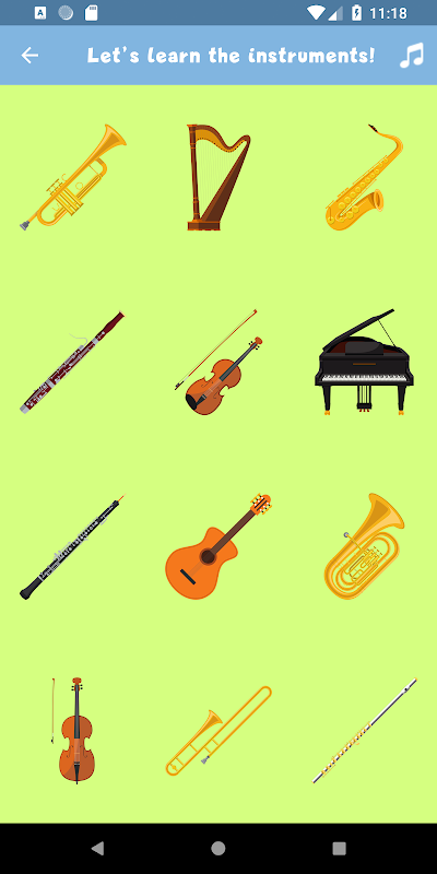 - बच्चे एक उपकरण का नाम सुन सकते हैं और चार संबंधित धुनों का आनंद ले सकते हैं