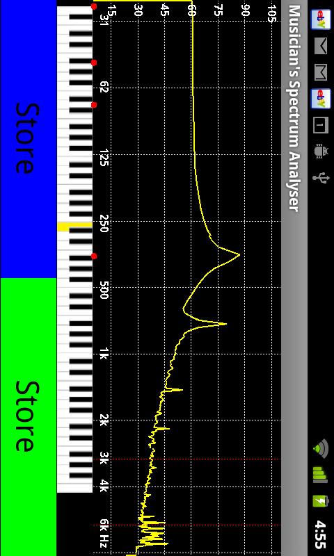 MSA displays an ordinary 88-note piano keyboard. It analyses frequencies upto just over 8 kHz, the vertical white line on the far right of the screen shows this frequency.