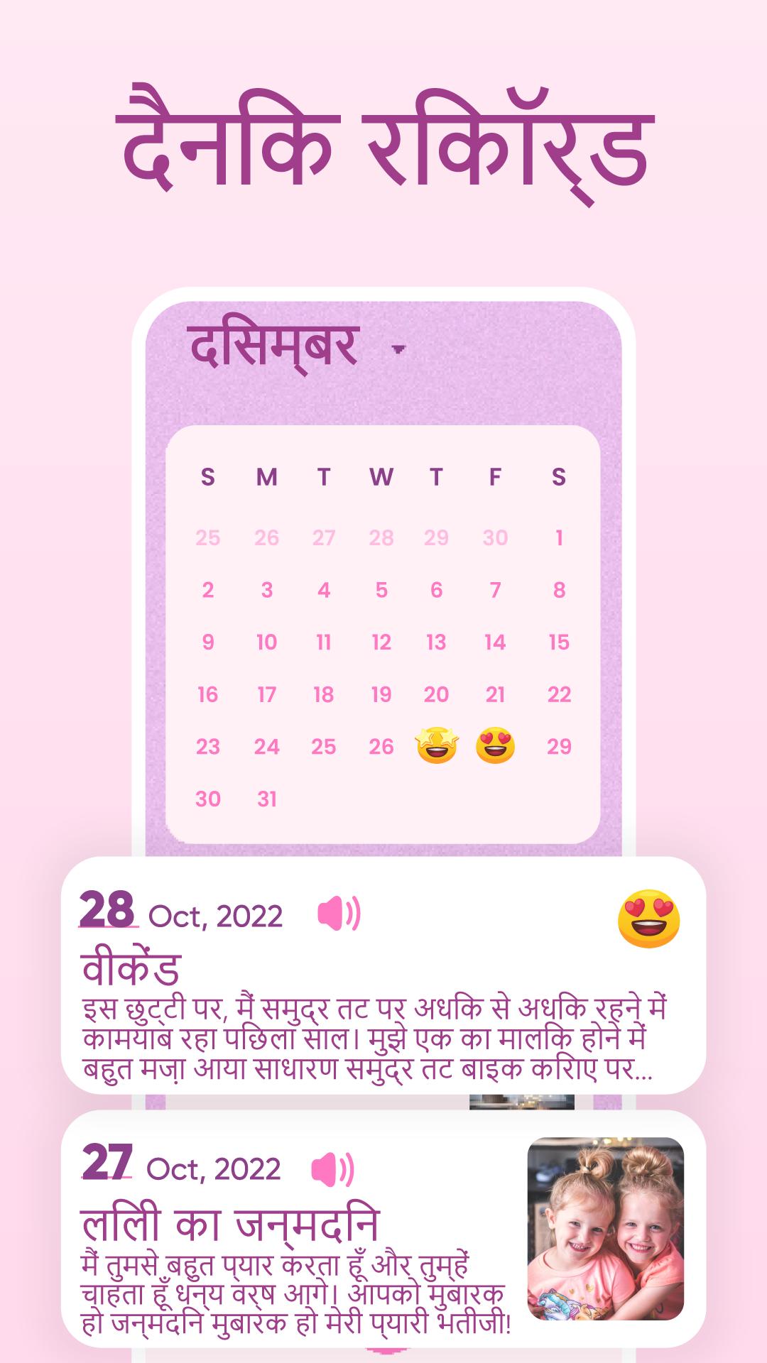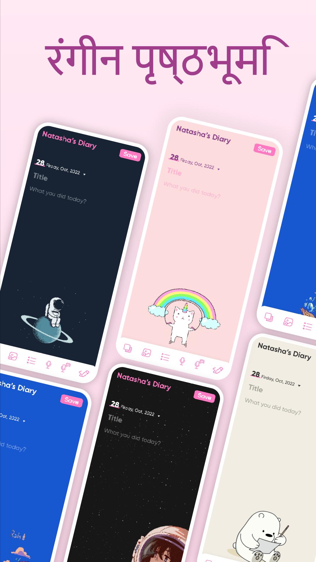 My Diary आपके दैनिक मूड, गुप्त विचारों, पसंदीदा क्षणों और यादगार यात्राओं को रिकॉर्ड करने के लिए एक दैनिक जर्नल डायरी ऐप है। यदि आपके पास बात करने के लिए कोई नहीं है या आप अपनी पसंदीदा यादों का रिकॉर्ड रखना चाहते हैं, तो यह मिनीनोट या जर्नलिंग ऐप आपके लिए एक आदर्श विकल्प है। यह दैनिक पत्रिका ऐप आपका सबसे अच्छा दोस्त है जिसके साथ आप सब कुछ साझा कर सकते हैं।