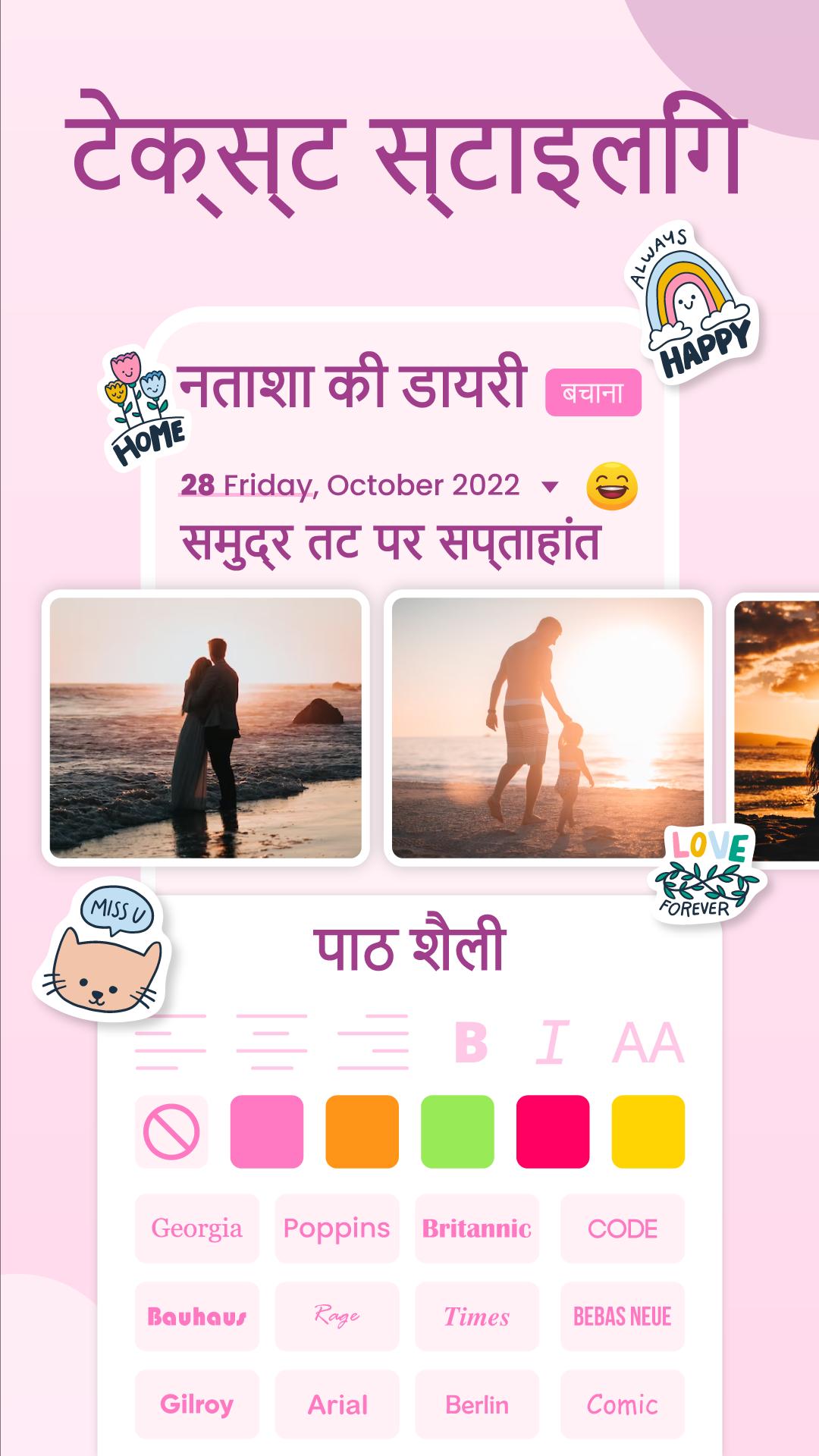 आप इस mi diario डेली जर्नल डायरी ऐप में बैकग्राउंड, टेक्स्ट कलर और फोंट बदलकर अपने फीलिंग नोट्स को खूबसूरती से कस्टमाइज कर सकते हैं। आप इस डेली बीन माय डायरी ऐप का उपयोग करके अपने वर्तमान मूड के अनुसार इमोजी और टेक्स्ट स्टाइल चुन सकते हैं।