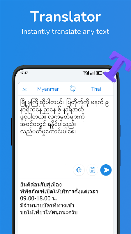 - बिजली की तेजी से अनुवाद: म्यांमार बर्मीज़ से थाई और थाई से म्यांमार बर्मीज़ तक जटिल अनुच्छेदों का भी त्वरित अनुवाद प्राप्त करें