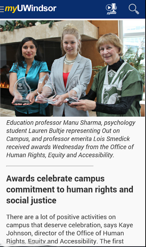 Put the University of Windsor experience in the palm of your hand with the new myUWindsor application. Designed to connect students with the latest news, course schedules and social events, the app offers convenience and accessibility with just one touch. Alumni and visitors can also access the app to use the campus map, directory and more. The myUWindsor app allows the entire campus community to stay in touch.