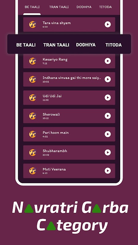 कई श्रेणी: उपयोगकर्ता के लिए कई विकल्प हैं। आसानी से गरबा गीत ट्रैक चुनें और इसे बजाएं।