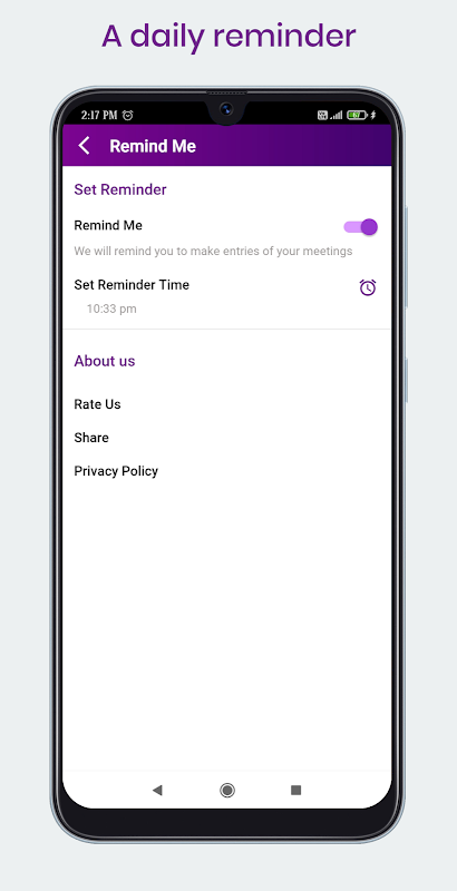 हर दिन आपको अपनी बैठक का विवरण दर्ज करना होगा यानी बैठक का कारण, बैठक का स्थान, बैठक में आपके द्वारा मिले हुए व्यक्ति (उनका नाम और संपर्क नंबर) भी तारीख और समय। तात्कालिकता के मामले में, आप इस विवरण तक पहुंच सकते हैं, और आसानी से उनसे संपर्क कर सकते हैं। हम आपको एक दिन में अपनी मीटिंग विवरण दर्ज करने के लिए दैनिक (रात 8 बजे) याद दिलाते हैं।
