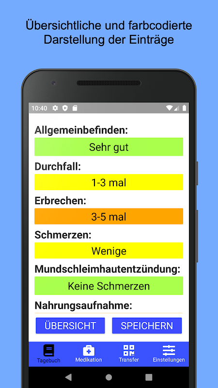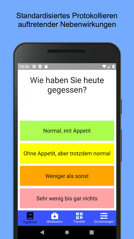 * आम ट्यूमर थेरेपी साइड इफेक्ट मूल्यांकन प्रणाली (CTCAE) के अनुसार ऐप के उत्तर डॉक्टर के लिए एक आसान व्याख्या सक्षम करते हैं।