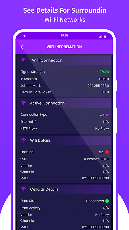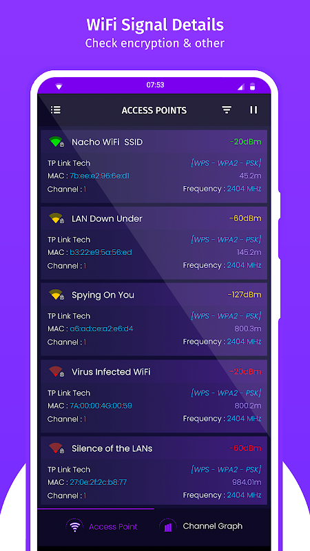 Optimize your WiFi network using WiFi Analyzer (open-source) by examining surrounding WiFi networks, measuring their signal strength as well as identifying crowded channels. When you open our wifi analyzer, you will find explanatory content, this will help you understand how to use the application, once you are clear about the use of our application, you will see three important sections. Network Analyzer - WiFi Analyzer Provide all information about wifi in details. This app includes channel graphs and access points.
