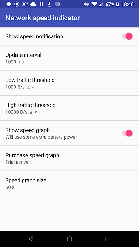The status bar notification shows the network speed in numbers or optionally as graph.