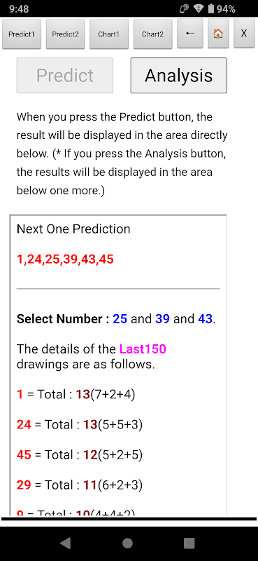 जब आप विश्लेषण बटन पर क्लिक करते हैं, तो आप भविष्यवाणी करते समय समान सेटिंग्स के साथ प्रत्येक चयनित संख्या की अन्य संख्याओं के साथ संगतता की जांच कर सकते हैं।