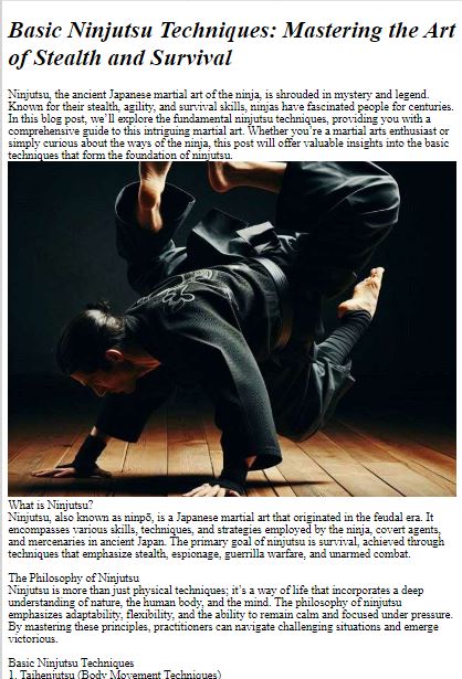 निन्जुत्सु, निंजा की प्राचीन मार्शल आर्ट, जासूसी, अस्तित्व और युद्ध के लिए विकसित तकनीकों और कौशल की एक विविध श्रृंखला को शामिल करती है। सामंती जापान के इतिहास और संस्कृति में निहित, निंजुत्सू मानसिक अनुशासन के साथ शारीरिक कौशल का मिश्रण करते हुए, चुपके, चपलता और रणनीति पर ध्यान केंद्रित करता है। यह निन्जुत्सु पाठ ट्यूटोरियल शुरुआती और उन्नत अभ्यासकर्ताओं के लिए एक व्यापक मार्गदर्शिका प्रदान करता है, जिसमें मूलभूत तकनीकों, हथियार कौशल और निन्जुत्सु के दार्शनिक पहलुओं को शामिल किया गया है।