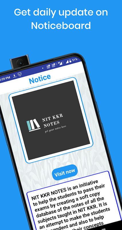 एनआईटी केकेआर नोट्स एनआईटी केकेआर में पढ़ाए गए सभी विषयों के नोट्स की सॉफ्ट कॉपी डेटाबेस बनाकर छात्रों को परीक्षा पास करने में मदद करने की एक पहल है। यह छात्रों को स्वतंत्र बनाने के साथ-साथ उन्हें किसी की मदद के बिना अपनी अवधारणाओं को स्पष्ट करने में मदद करने का एक प्रयास है। वे दिन आ गए जब आपको लाइब्रेरी से बाहर फोटोकॉपी नोटों की कतार लगानी पड़ेगी। इस ऐप का उद्देश्य छात्रों के शैक्षणिक प्रदर्शन में सुधार करना है ताकि वे अन्य चीजों जैसे कि सॉफ्ट स्किल, एक्स्ट्रा करिकुलर एक्टिविटीज, दोस्तों के साथ घूमना, म्यूजिकल इंस्ट्रूमेंट आदि सीखना आदि पर ध्यान केंद्रित कर सकें और परीक्षा की चिंता न करें। ।