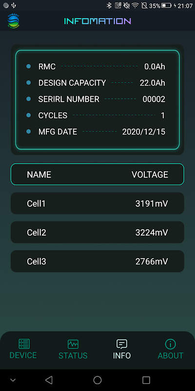 ऐप हमारी कंपनी द्वारा निर्मित बैटरियों के साथ एक ब्लूटूथ कनेक्शन स्थापित करता है, जो उपयोगकर्ताओं को बैटरी के प्रदर्शन और स्थिति का व्यापक अवलोकन प्रदान करता है। यह बैटरी स्तर, तापमान, वोल्टेज, करंट, चार्जिंग और डिस्चार्जिंग स्थिति, चार्जिंग और डिस्चार्जिंग समय, चक्र गणना और व्यक्तिगत सेल वोल्टेज जैसी आवश्यक जानकारी प्रदर्शित करता है।