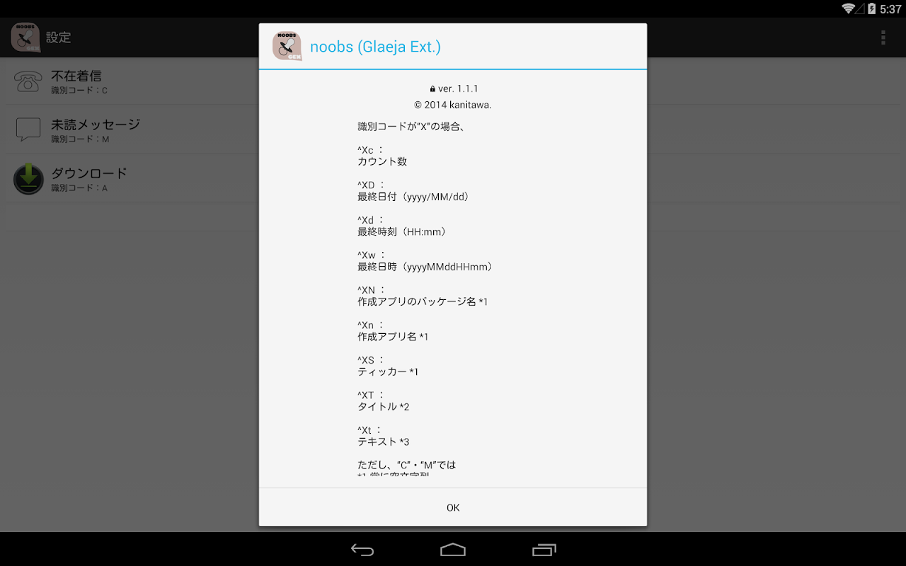 「noobs」をインストールすることで、不在着信・未読メッセージ(SMS/MMS)および任意アプリの通知に関する情報が『Glaeja』で取り扱えるようになります。