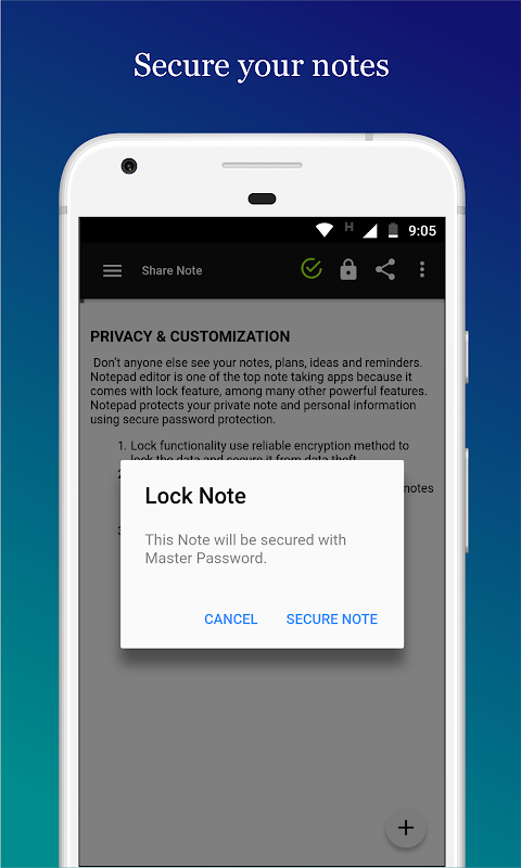 Don’t anyone else see your notes, plans, ideas and reminders. Notepad editor comes with lock feature, among many other powerful features. Notepad protects your private note and personal information using secure password protection. Lock functionality use reliable encryption method to lock the data and secure it from data theft. Choose note font style and size. Easy to use customization option too. You can create as many notes as you want.