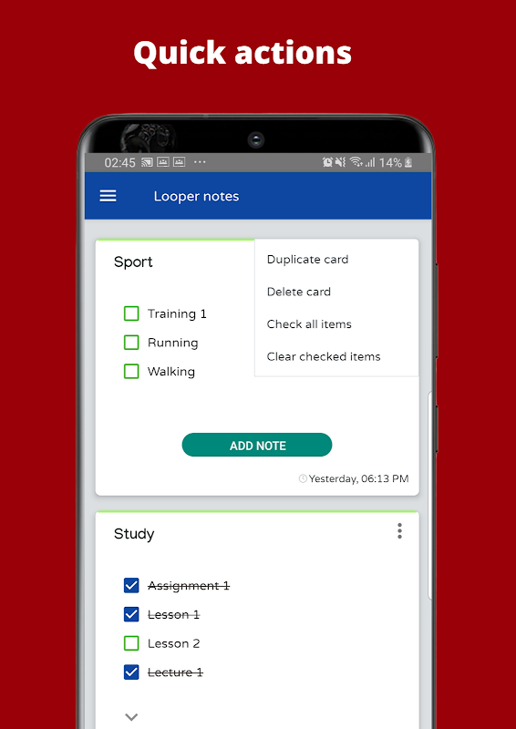 Looper notes comes to keep your thoughts and notes arranged in one place, with cards design that makes it easier to organize and work with your notes and tasks.
