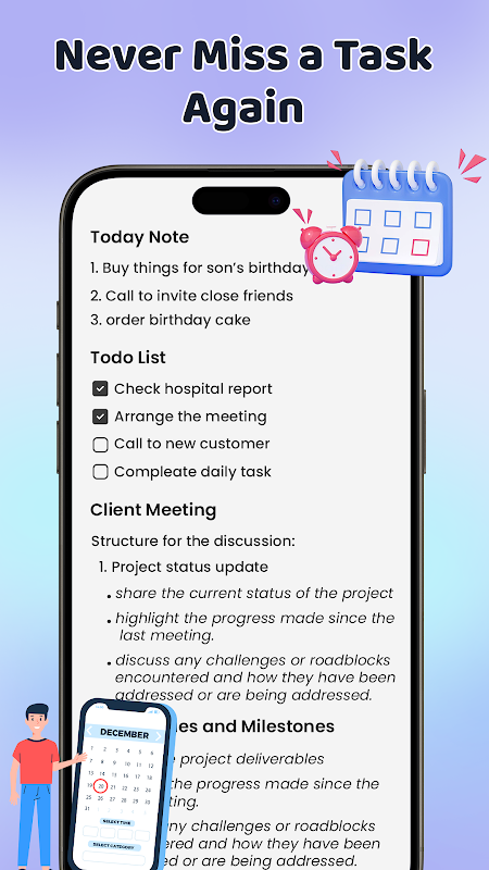 कभी भी महत्वपूर्ण विवरण न चूकें! हमारे नोट्स ऐप में एक स्मार्ट आफ्टर-कॉल स्क्रीन है, जो आपको प्रत्येक कॉल के ठीक बाद टेक्स्ट नोट्स और चेकलिस्ट तक त्वरित पहुँच प्रदान करती है। चाहे वह कोई कार्य चर्चा हो, अपॉइंटमेंट रिमाइंडर हो या कोई व्यक्तिगत कार्य हो, कॉल समाप्त होते ही उसे नोट कर लें या रिकॉर्ड कर लें - जब तक वह अभी भी ताज़ा हो।