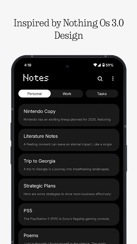 सिंपली नोटिंग की दुनिया में आपका स्वागत है। एक न्यूनतम नोट्स ऐप जो नथिंग ओएस की शानदार सुंदरता को प्रदर्शित करता है। चाहे वह व्यक्तिगत विचार-विमर्श हो, काम के विचार हों, या आपकी किराने की सूची हो, हमने आपको कवर कर लिया है। अनुस्मारक सेट करें, अपने निजी वॉल्ट में पासवर्ड लिखें और यह सब सुरक्षित रखें। कोई दिखावा नहीं, कोई तामझाम नहीं, कोई छवि या वीडियो नहीं, बस शुद्ध, सरल... ध्यान दें।