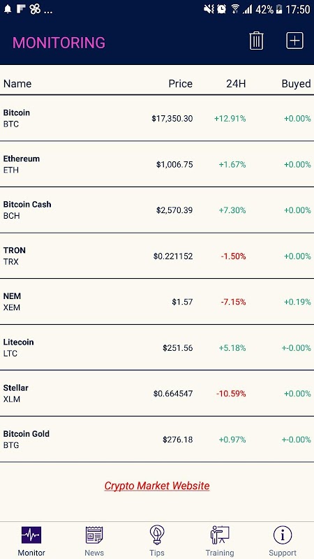 This is an utility app for tracking price change of Crypto Currency. By choosing setting UP and DOWN level by yourself, user can receive the notification immediately when price of their investing coin is down or up.