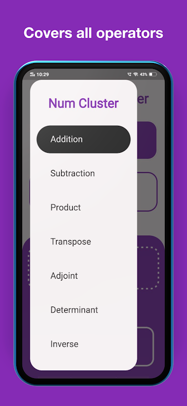 This app gives step by step solution to the given matrix problem. It can do addition, subtraction, multiplication, product, adjoint, determinant and inverse of a given matrix. It also gives steps to each of the given question inputted. The whole app is created in beautiful ui to ease your eyes.
