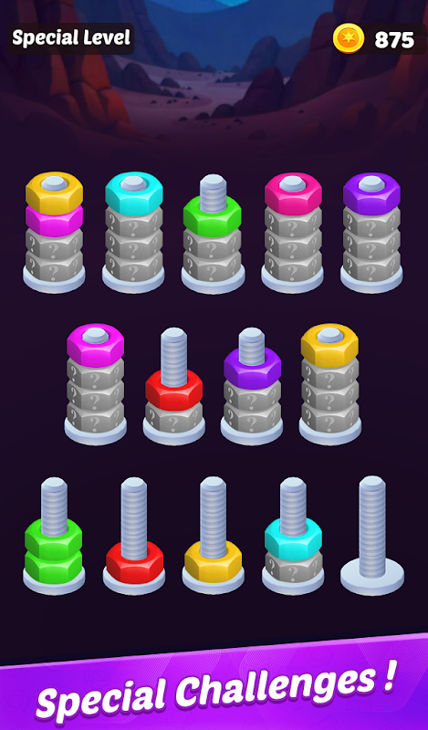 बिना सोचे-समझे गलत नट सॉर्ट चालें नट और बोल्ट को पूरी तरह से जाम कर सकती हैं - इसलिए हर मोड़ और मोड़ की सावधानीपूर्वक योजना बनाएँ। यह सिर्फ़ एक नट गेम नहीं है - यह पूरी तरह से दिमाग की तर्क पहेली है!