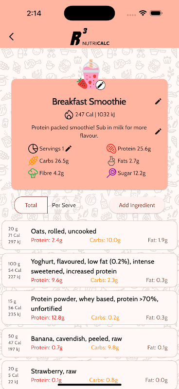 व्यापक खाद्य डेटाबेस: रोजमर्रा के भोजन से लेकर लजीज व्यंजनों तक सामग्री और भोजन की एक विशाल लाइब्रेरी तक पहुंच, सभी इष्टतम पोषण के लिए तैयार किए गए हैं। खाद्य मानक ऑस्ट्रेलिया न्यूजीलैंड के साथ बनाया गया।