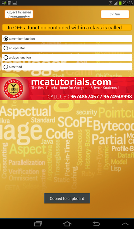 ऑब्जेक्ट ओरिएंटेड प्रोग्रामिंग प्रश्न और उत्तर - इस आवेदन जो ऑब्जेक्ट ओरिएंटेड प्रोग्रामिंग सीखने और परिसर में साक्षात्कार के लिए तैयारी कर रहे छात्रों के लिए बहुत उपयोगी है। आप जानते हैं, अब एक दिन हर प्रतियोगी परीक्षाओं में, एकाधिक पसंद सवालों देखते हैं। इस एप्लिकेशन के उनके सही जवाब के साथ 100 एकाधिक पसंद सवालों है। ये सवाल गेट, नेट और स्लेट की तरह परीक्षा में पूछा frequents हैं।