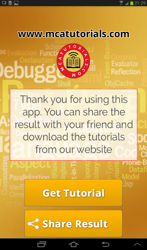 सत्र के अंत में, यह एक पाई ग्राफ के साथ परिणाम प्रदर्शित करता है। आप अपने दोस्तों के साथ इस परिणाम को साझा कर सकते हैं। आप इस विषय के बारे में अधिक जानकारी चाहते हैं, अनुप्रयोग भी मुक्त करने के लिए ट्यूटोरियल है। यह एक व्यापक उपकरण है कि आप ऑब्जेक्ट ओरिएंटेड प्रोग्रामिंग परीक्षा के लिए तैयार करता है।