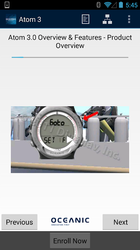 Each Oceanic Dive Computers class is organized based on progressive learning and as such the user is recommended to follow the modules and sections in sequence. At the same time, the interactive organization of the class allows student to directly access a specific section for easier reference.