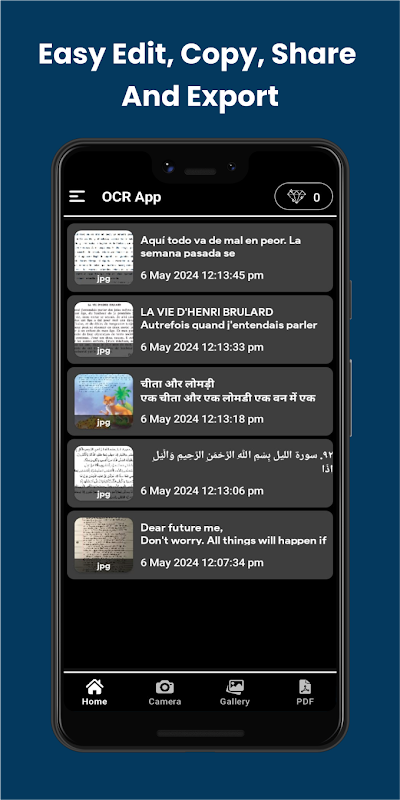 3. पीडीएफ से टेक्स्ट स्कैन करें: ऐप खोलें, "पीडीएफ से टेक्स्ट स्कैन करें" पर क्लिक करें, एक पीडीएफ फाइल चुनें, और निकाले गए टेक्स्ट को देखें और संपादित करें।