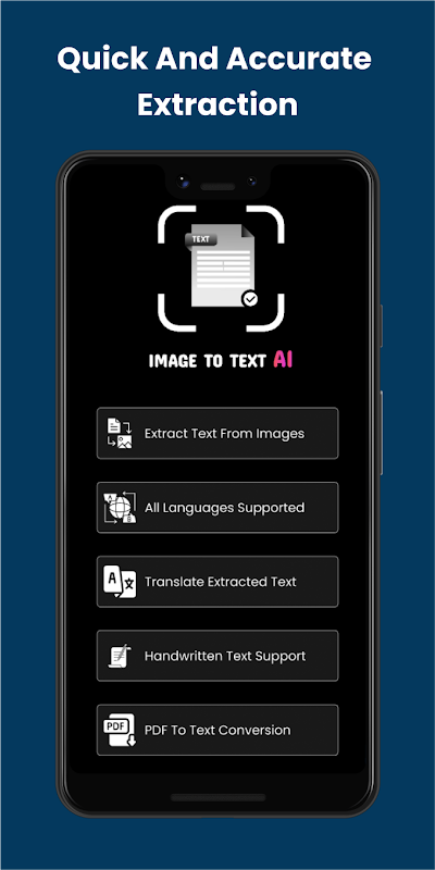 हमारी इमेज टू टेक्स्ट स्कैनर ऐप चुनने के लिए धन्यवाद। दक्षता और सटीकता के साथ अपनी पाठ निष्कर्षण आवश्यकताओं को सरल बनाएं।