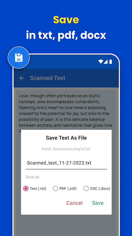 फ़ोटो और दस्तावेज़ों को आसानी से txt में बदलें। बस कुछ ही टैप से फ़ाइलें। यह दस्तावेज़ स्कैनर ऐप एक उपयोगकर्ता के अनुकूल इंटरफ़ेस प्रदान करता है, जिससे आप कई फ़ोटो स्कैन कर सकते हैं और उन्हें TXT, PDF और दस्तावेज़ों सहित विभिन्न प्रारूपों में परिवर्तित कर सकते हैं। हमारे पिक्चर टू टेक्स्ट ऐप को भारी काम करने देकर समय और ऊर्जा की बचत करें।