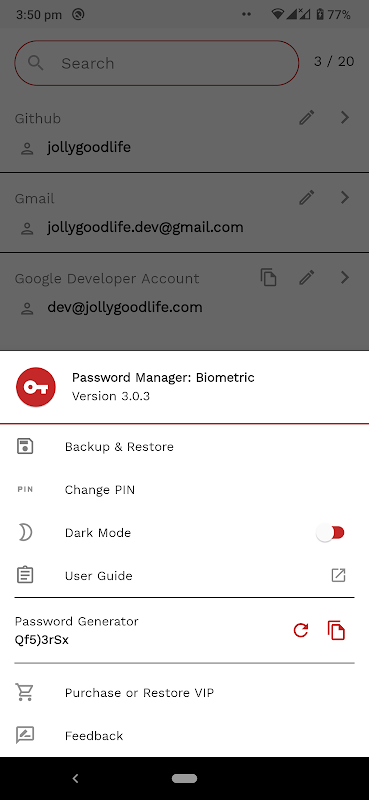 - ऐप गैर-वीआईपी उपयोगकर्ताओं को केवल 20 पासवर्ड तक सीमित करता है। कोई अन्य सीमा लागू नहीं की गई है. यदि आप किसी भी कारण से वीआईपी खरीदने में सक्षम नहीं हैं, तो हमें हमारे ईमेल पर संपर्क करें।
