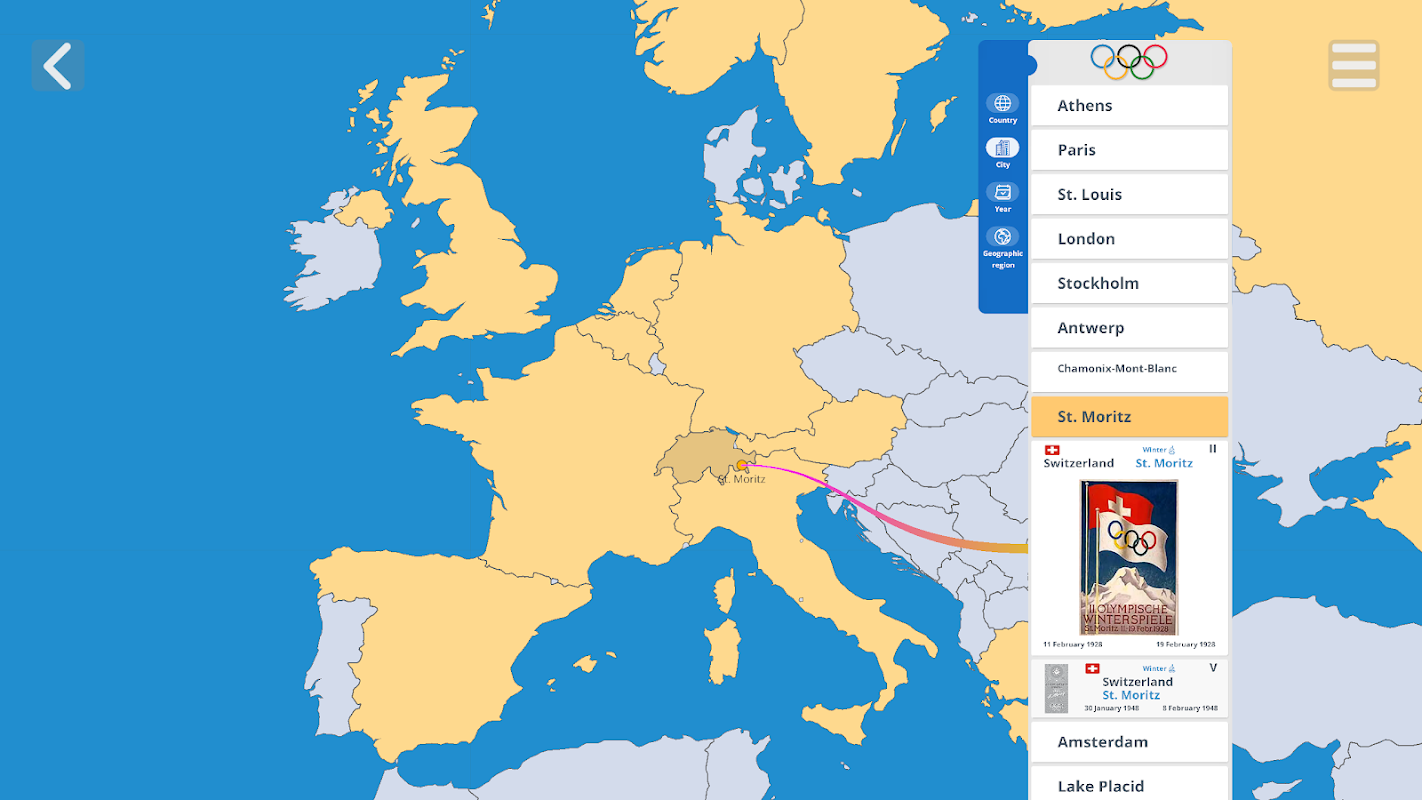 ऐप में उन सभी शहरों के मानचित्र शामिल हैं जिन्होंने पूरे इतिहास में ओलंपिक खेलों की मेजबानी की है। उपयोगकर्ता अतीत और भविष्य के ओलंपिक स्थलों के माध्यम से नेविगेट कर सकते हैं।