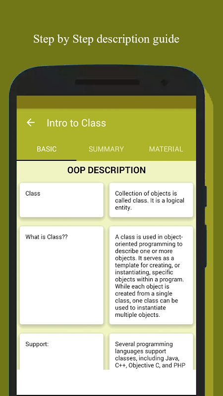 OOP Programming Concepts is an app especially developed for Beginner programmers which help the beginner students who want to learn the object oriented programming concepts in detail. Object Oriented Programming Concepts app is an app designed to teach you the fundamentals of Object-Oriented Programming based on Java.