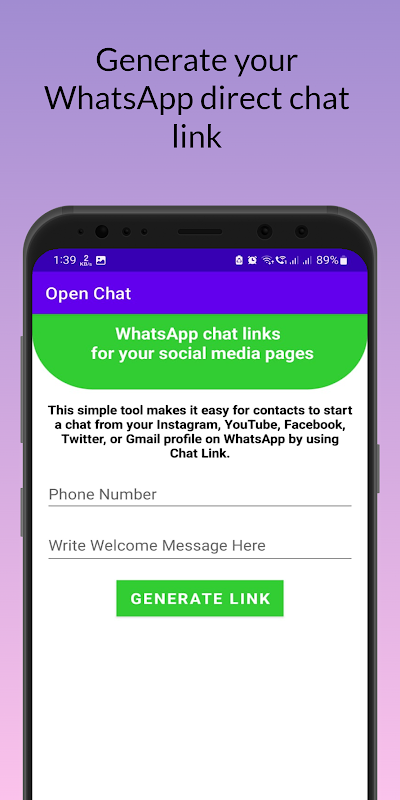 ओपन चैट संपर्कों के लिए चैट लिंक का उपयोग करके व्हाट्सएप पर आपके इंस्टाग्राम, यूट्यूब, फेसबुक, ट्विटर या जीमेल प्रोफाइल से चैट शुरू करना आसान बनाता है।