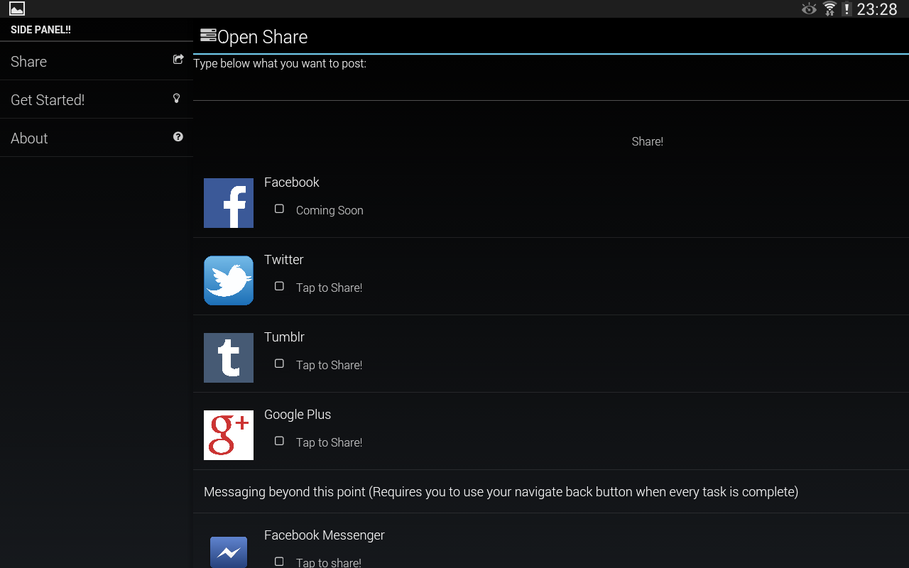 NOTICE: YOU MUST HAVE THE REQUIRED APPS INSTALLED FOR OPEN SHARE TO WORK, E.G FOR GOOGLE+ SUPPORT YOU MUST HAVE GOOGLE+ INSTALLED ON YOUR DEVICE