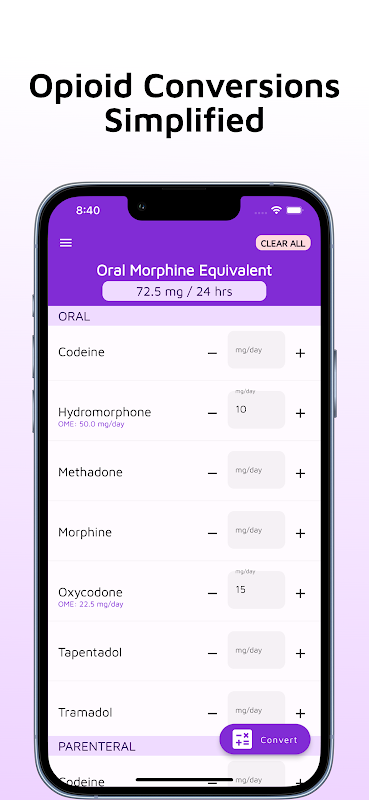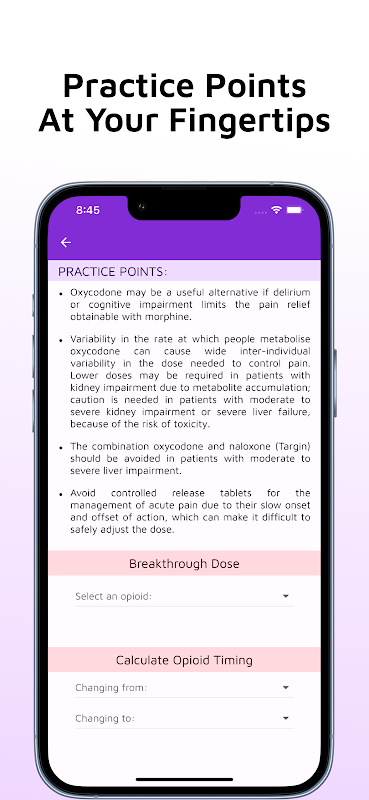 ऑल-इन-वन टूल: खुराक की गणना से लेकर फॉर्मूलेशन विकल्पों और अभ्यास बिंदुओं तक पहुंचने तक, यह ऐप कुशल ओपिओइड प्रबंधन के लिए तैयार किया गया है।